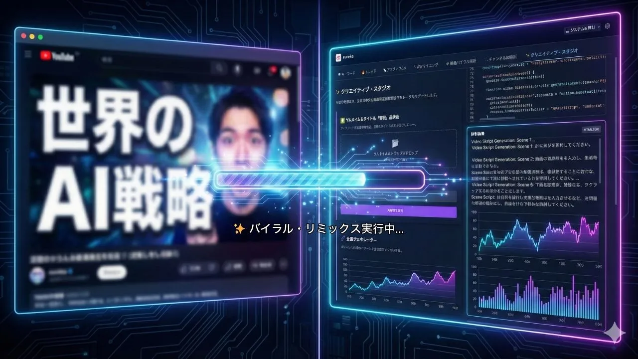 これが『eureka』の真骨頂です。見つけたヒット動画のボタンを1つ押すだけで、世界最高のYouTuberの特徴を移植したAI人格が、その動画の構造を因数分解し、「あなたのチャンネル用にリメイク」します。パクリではなく、より高度に進化させる錬金術です。